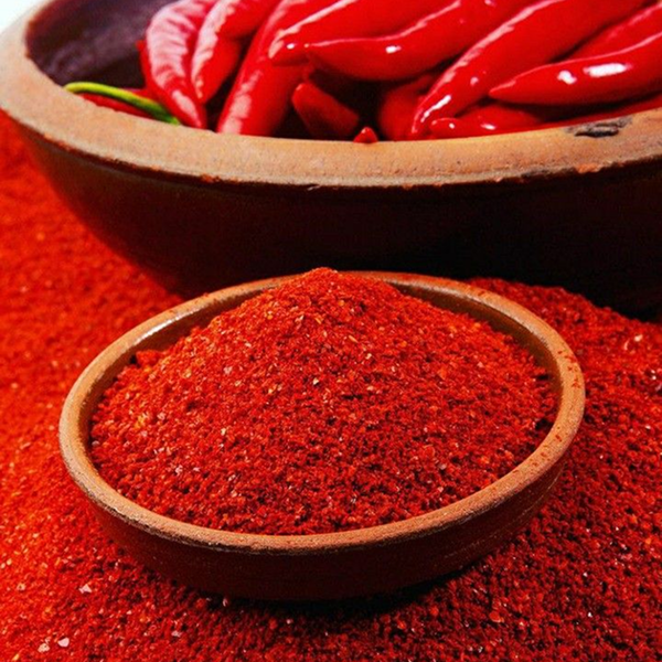 Vibrant red chili powder, finely ground and packed for safe global delivery.