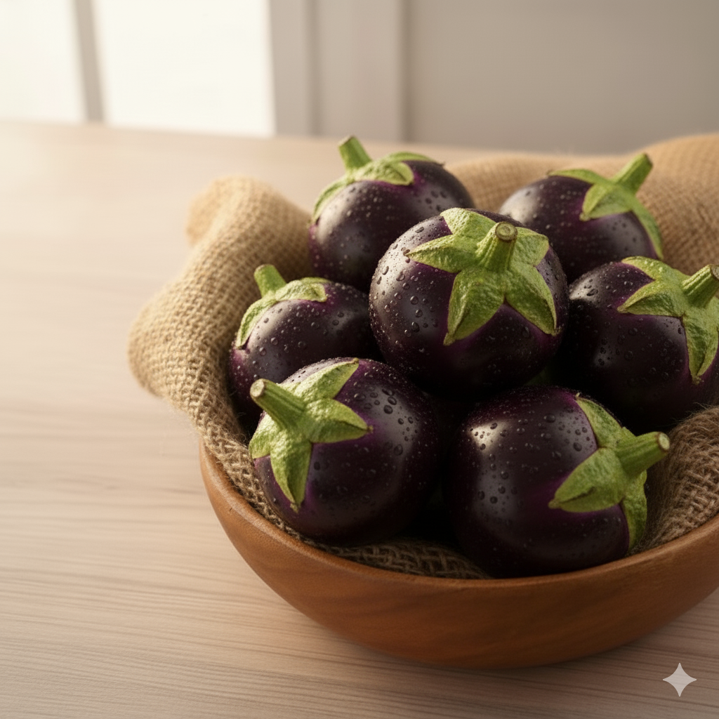 Plump and glossy brinjals, handpicked for superior freshness and natural flavor.